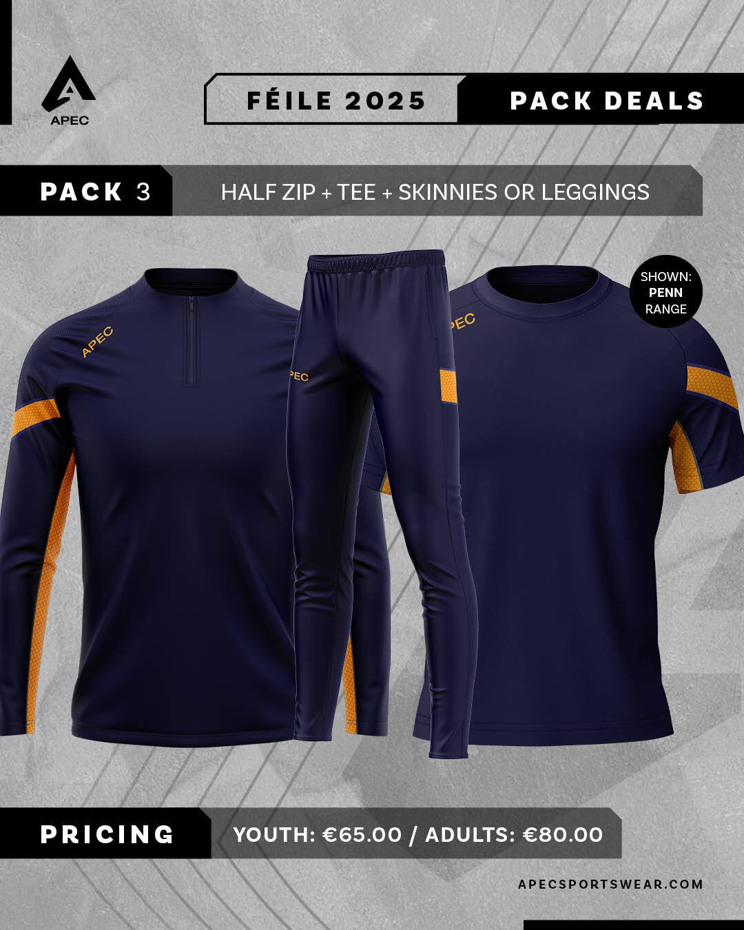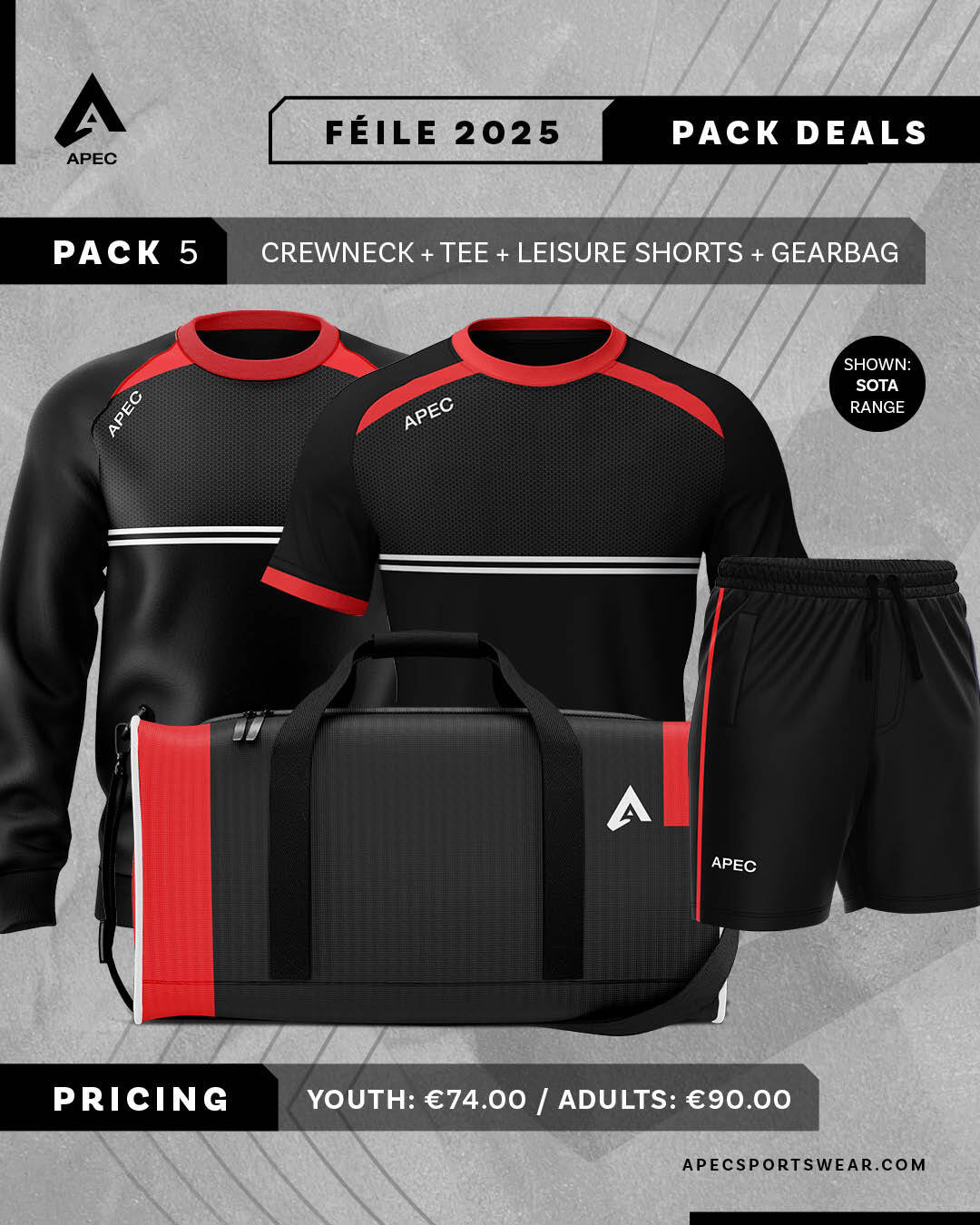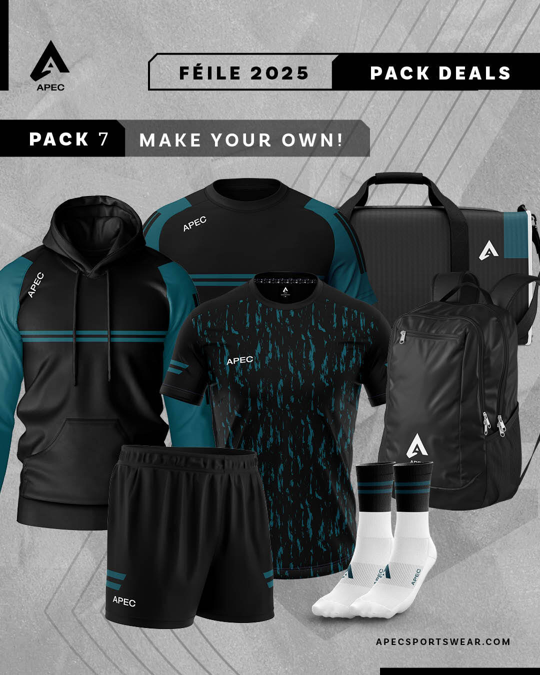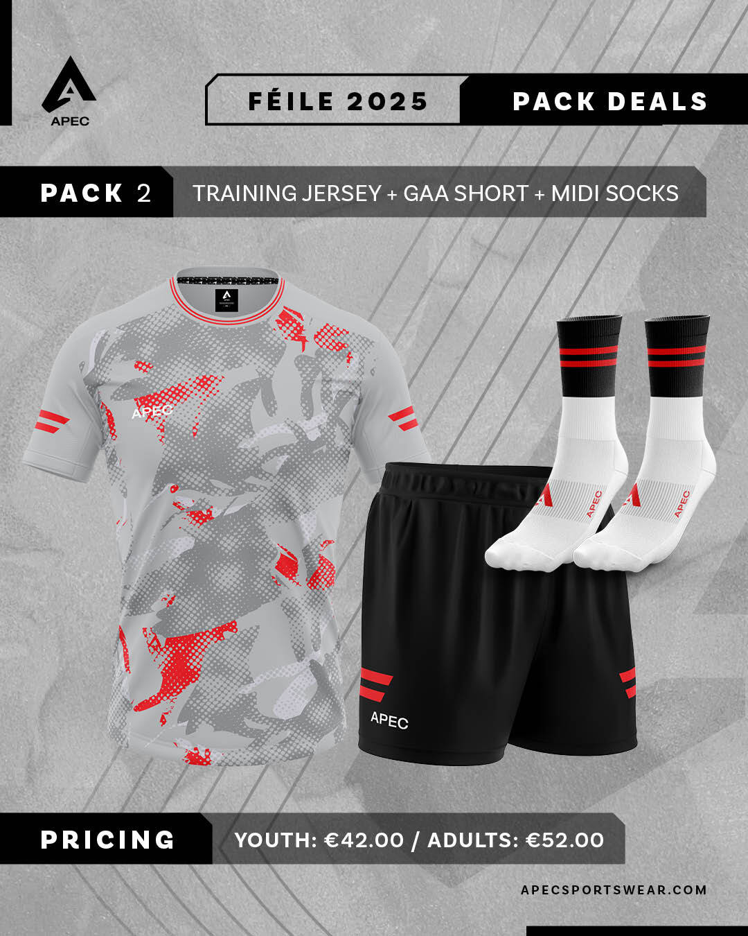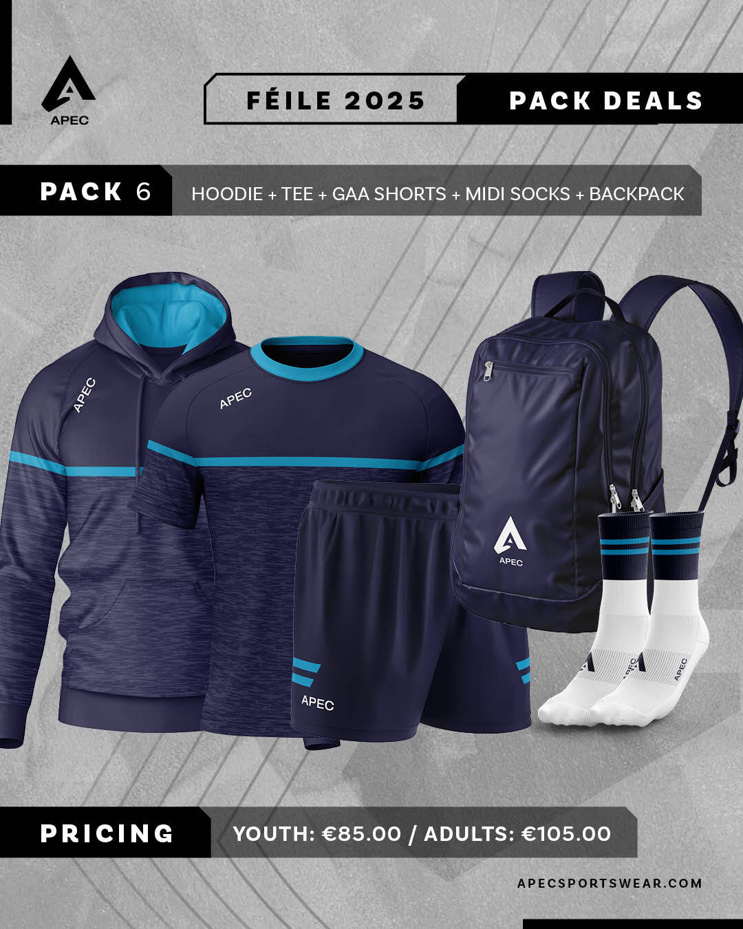 Pack includes Half Zip or Hoodie, Training Tee, Gaelic Shorts, Midi Socks and Backpack
