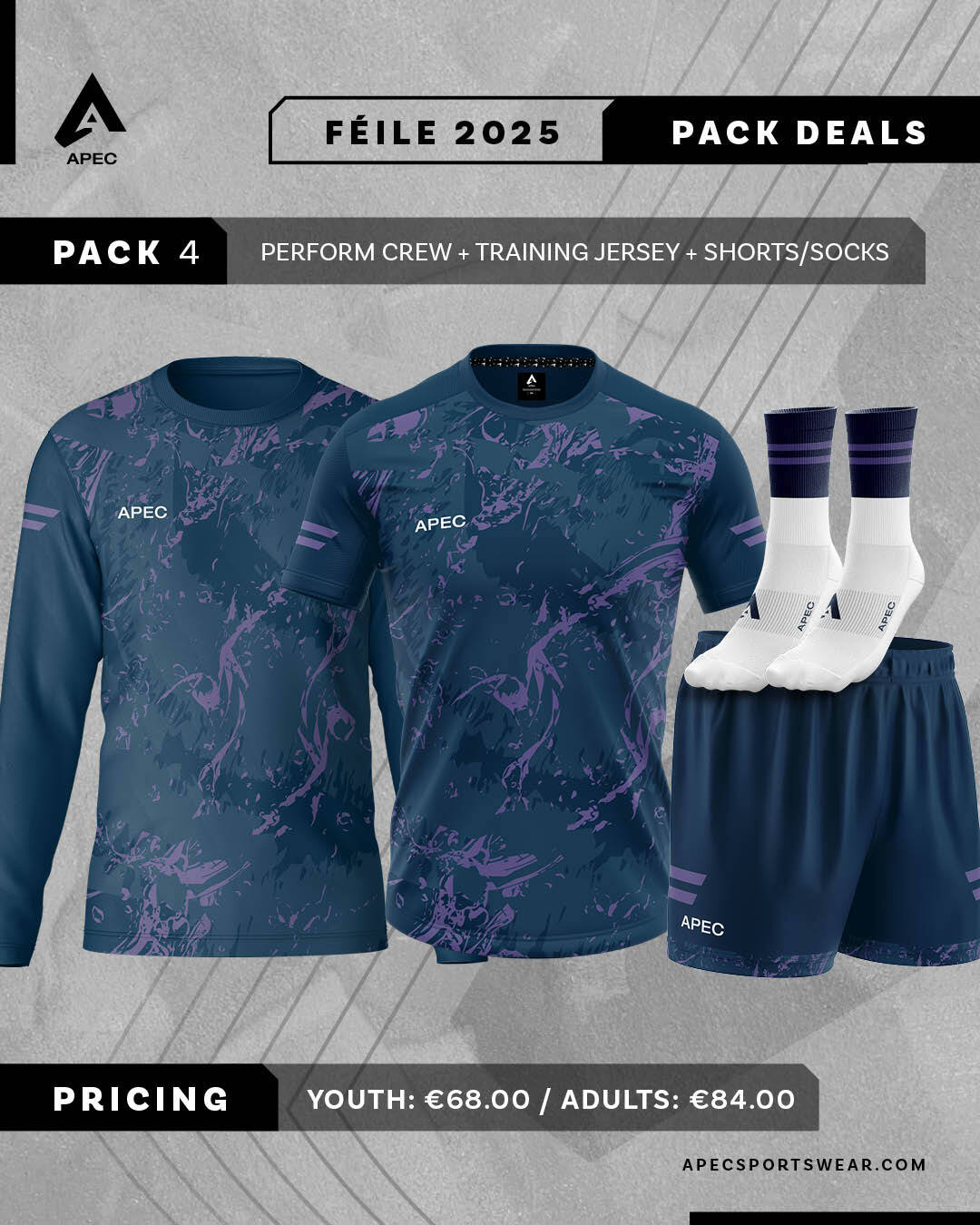 Pack includes Perform Crew Neck, Training Jersey, Gaelic Shorts and Midi Socks